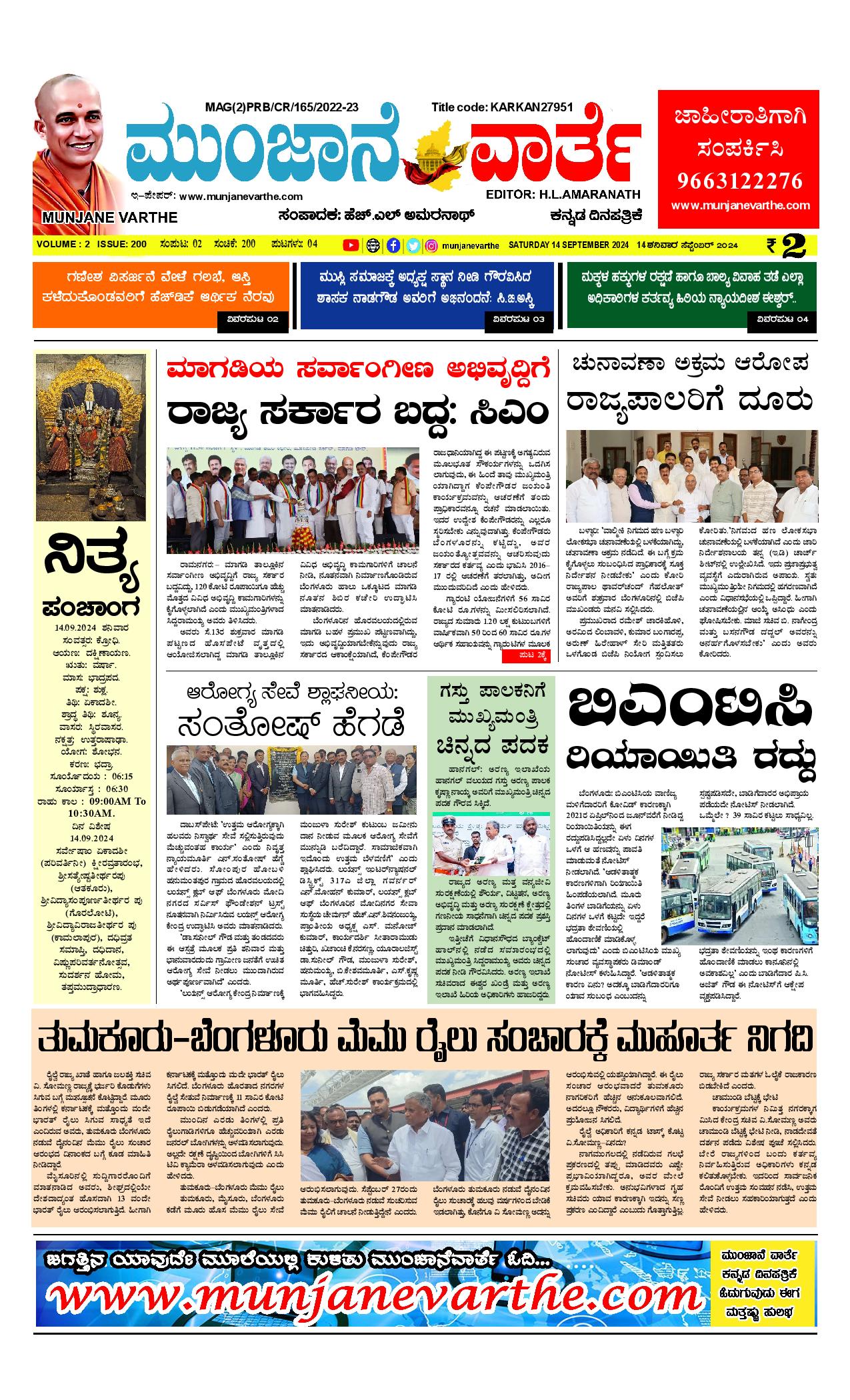ಮುಂಜಾನೆ ವಾರ್ತೆ 14-09-2024 Munjane varthe